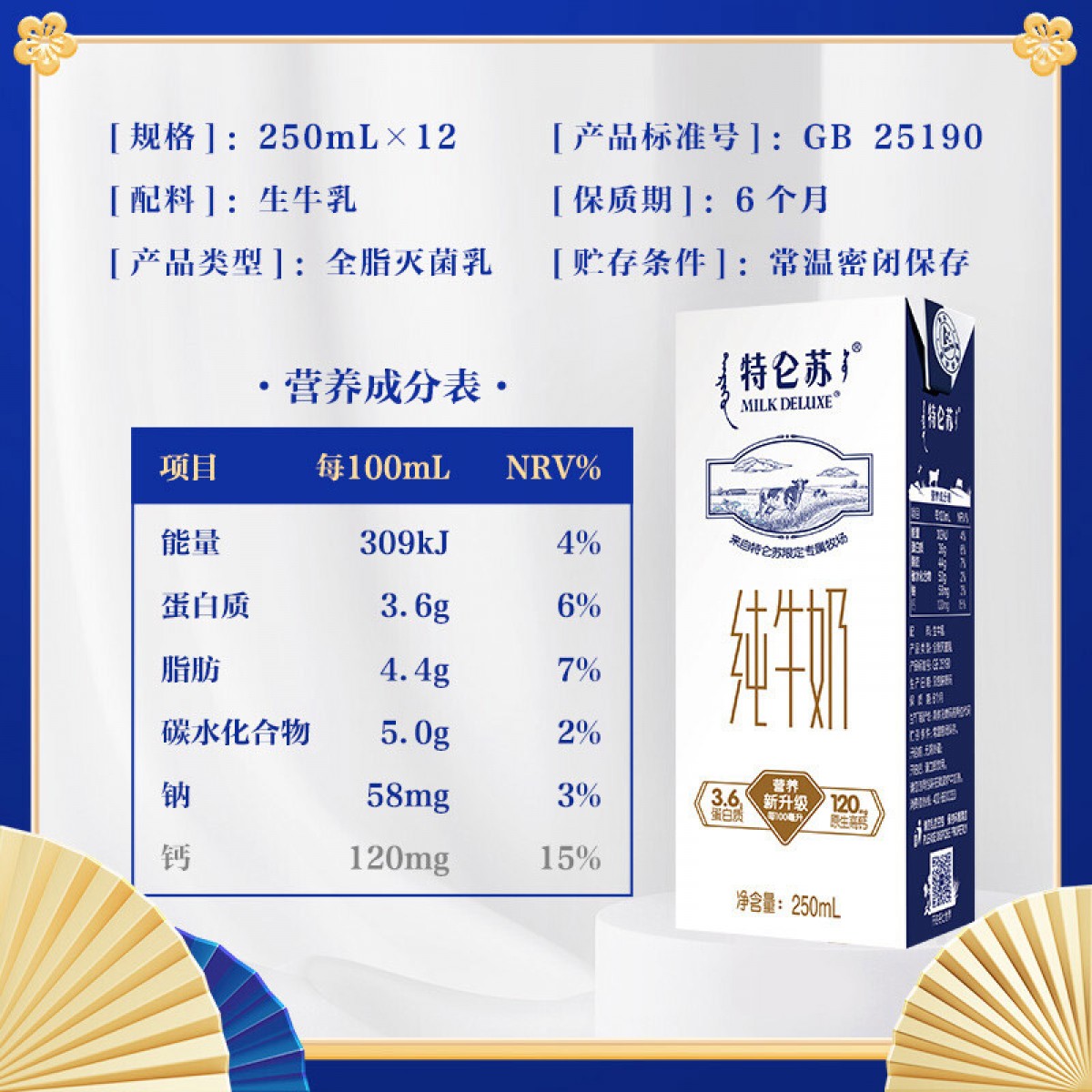 商品名称:蒙牛特仑苏纯牛奶(苗条装)250ml*12