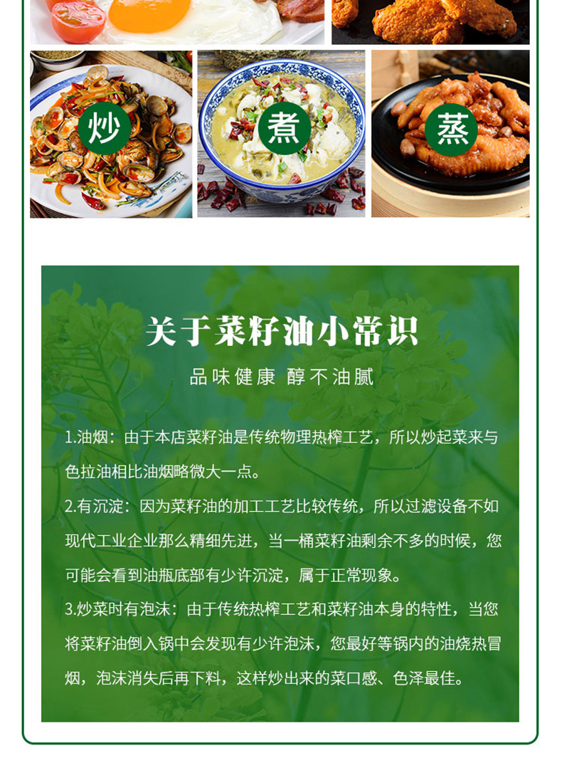 1.菜籽油是一种古老的食用油,它的使用已经有很长的历史,这种油最显著的特点就是胆固醇含量少,在现在高胆固醇高的情况下,菜