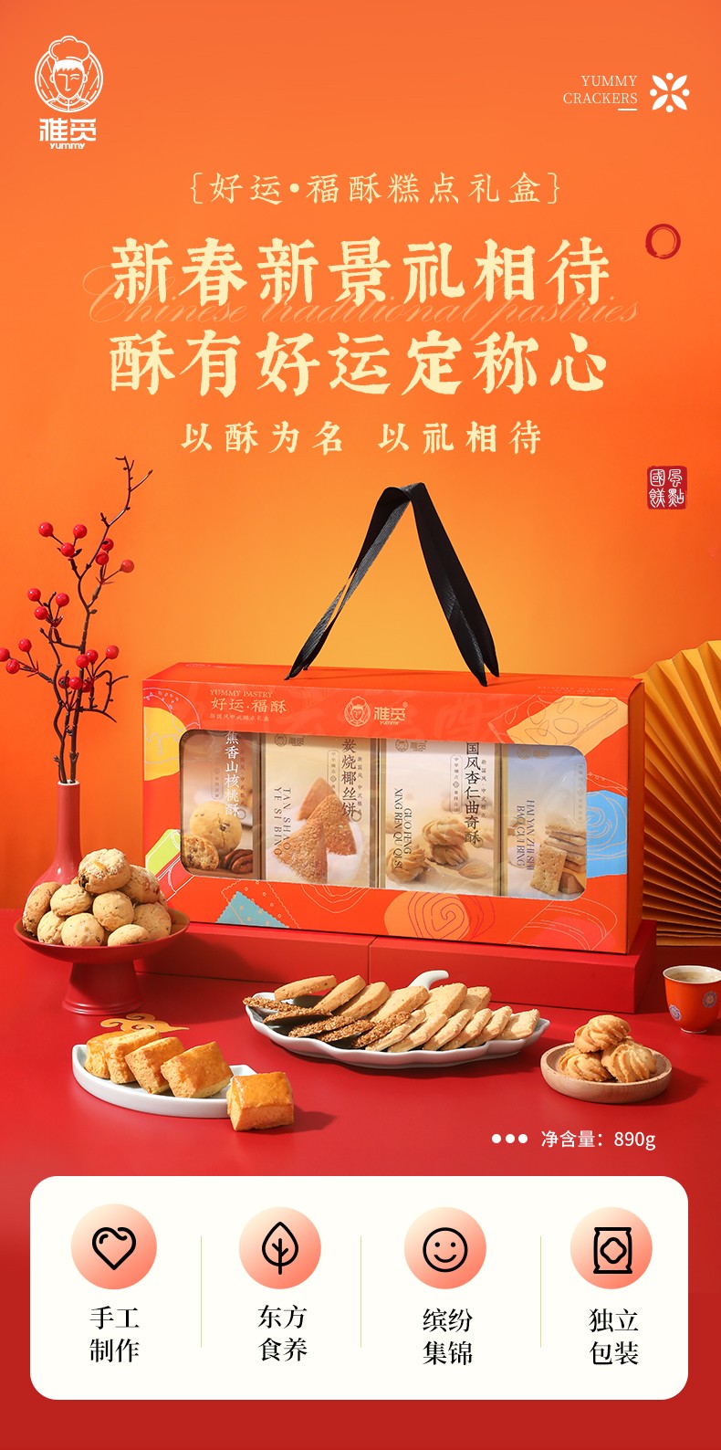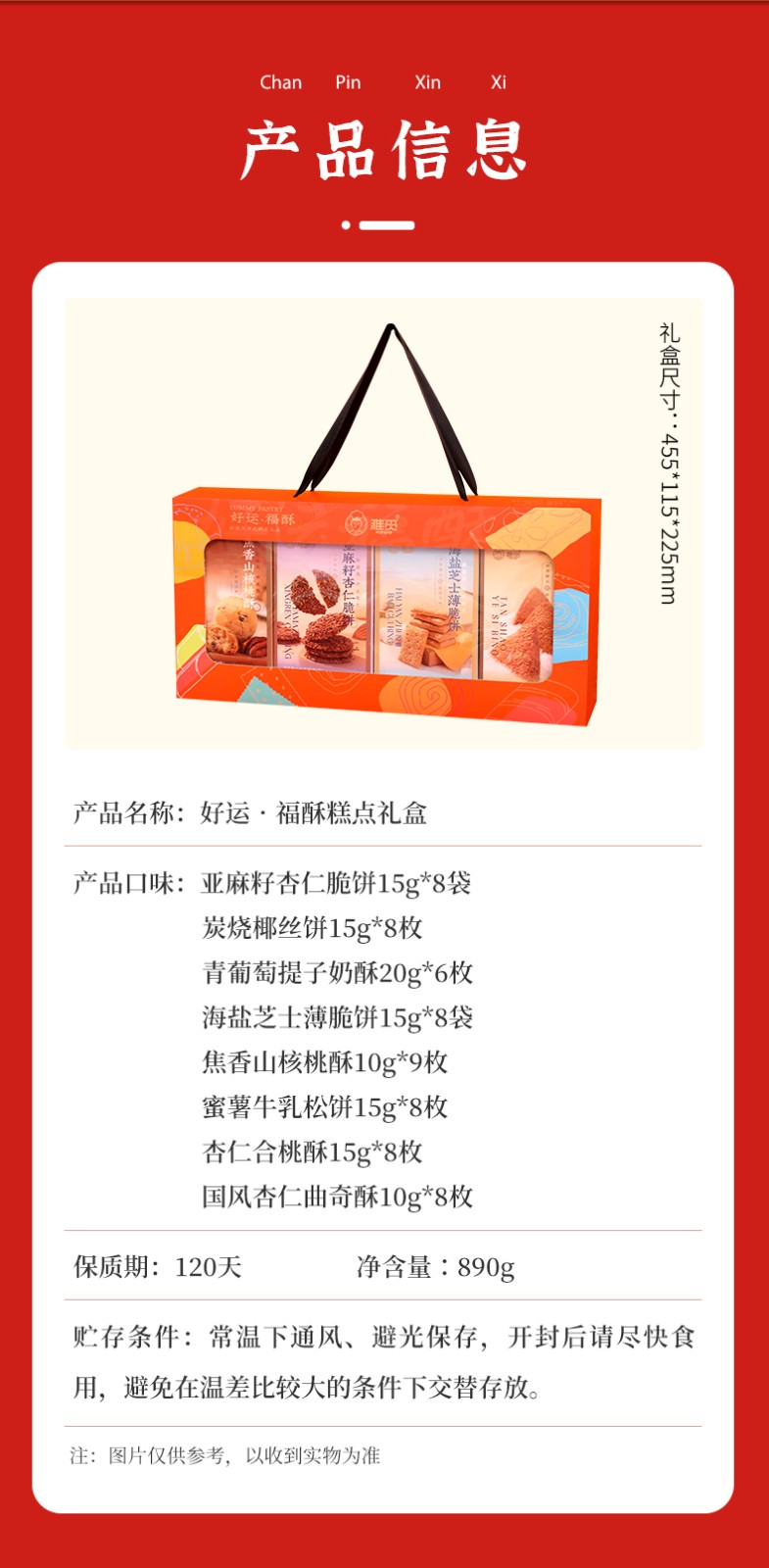 好运将至,万物“福酥” 此礼盒四酥四饼,能量补给,老少皆宜;甄选好食材,铸造好品质;谷香四溢,老少皆宜,用料扎实