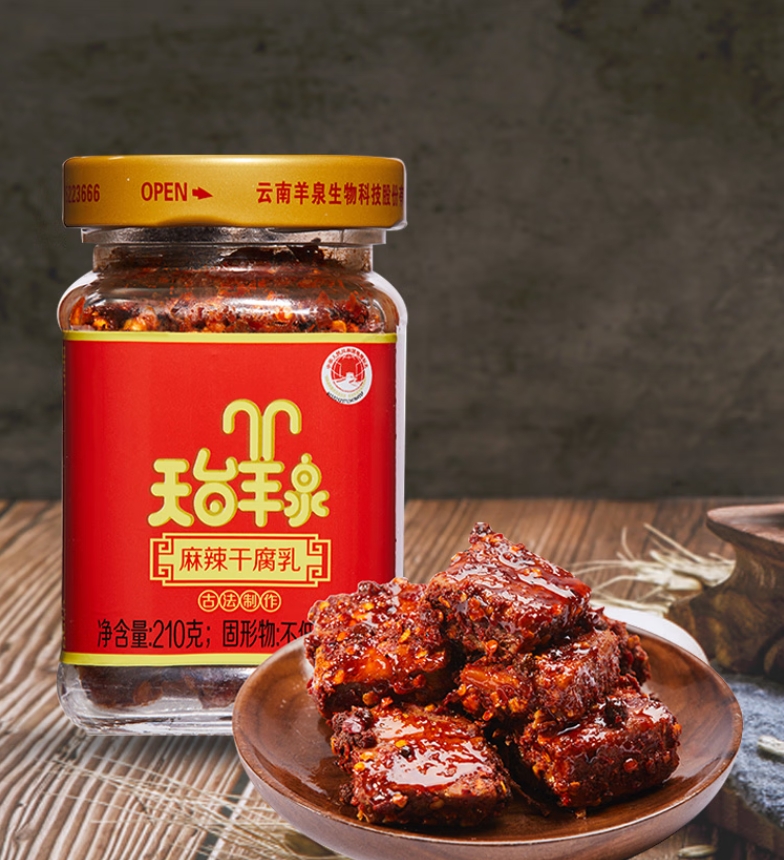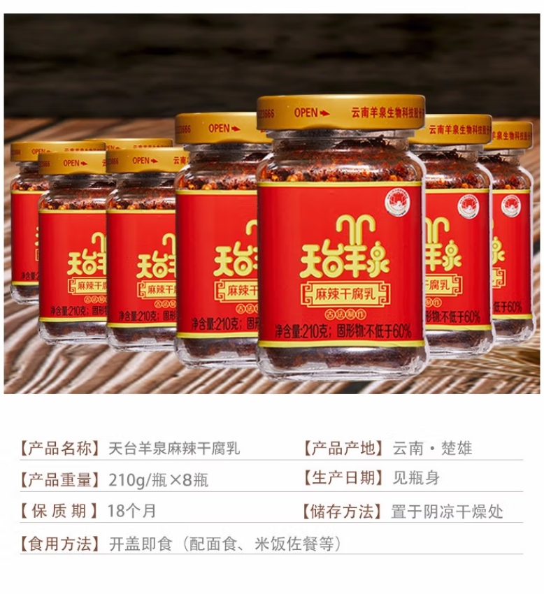 商品名称:天台羊泉麻辣干腐乳210g*8瓶云南特产豆腐乳 拌面下饭菜霉豆腐乳 调味卤腐 8瓶装