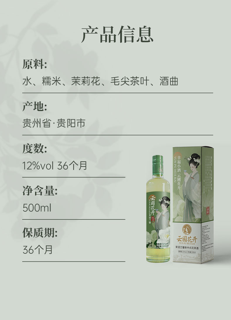 商品名称:云圃花开 茉语兰馨 中式花茶酒12度 500ml/瓶*6瓶装