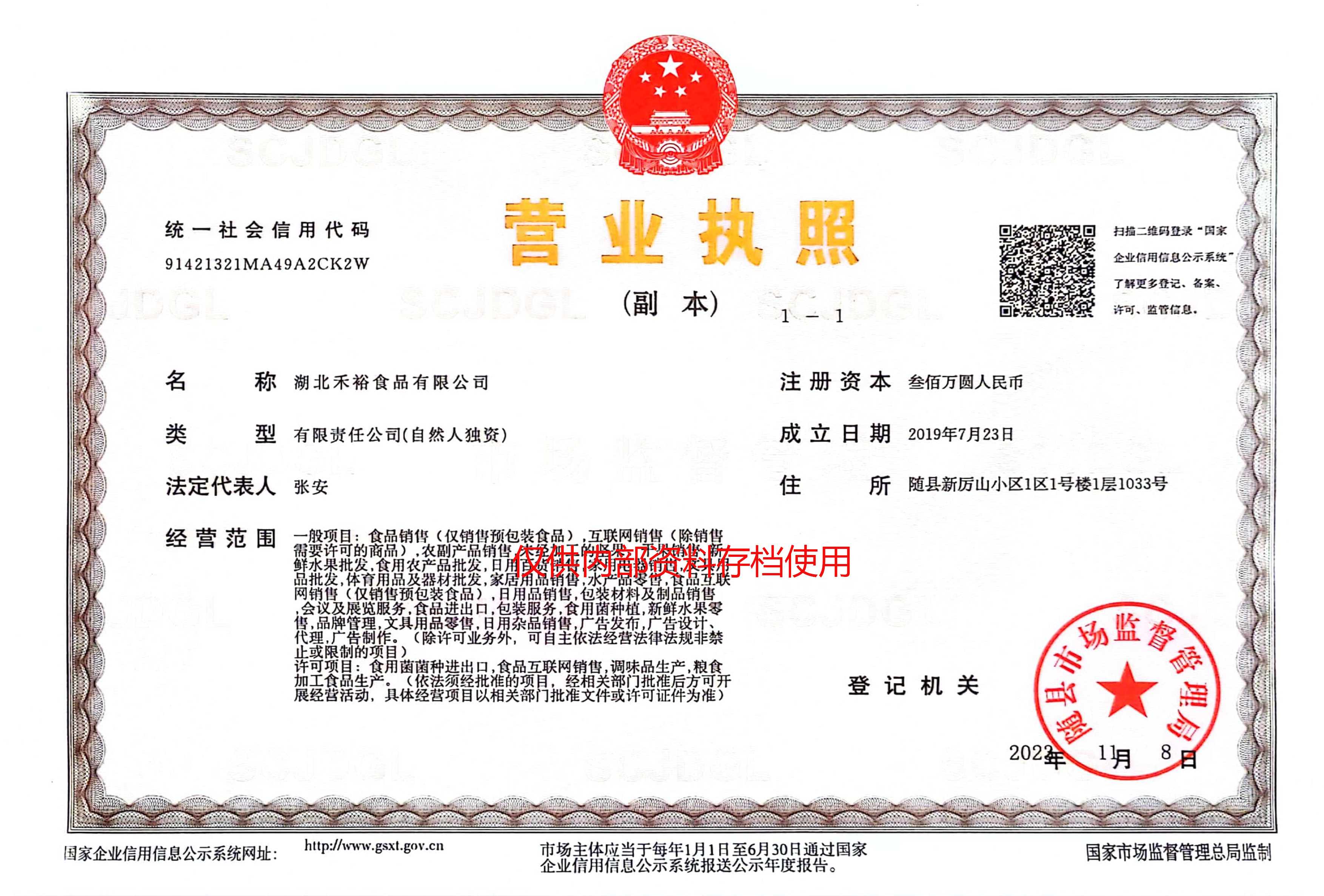 食品销售(仅销售预包装食品),互联网销售(除销售随肉需要许可的商品),农副产品销售,鲜水果批发,食用农产品批发,日用品批发,体育用品及器材批发,家居用网销售(仅销售预包装食品),日用品销售,包装材料及制品销售会议及展览服务,食品进出口,包装服务,食用菌种植,新鲜水果零售,品牌管理,文具用品零售,日用杂品销售,广告发布,广告设计代理,广告制作。(除许可业务外,可自主依法经营法律法规非禁止或限制的项目)许奇项目:食用菌菌种进出口,食品互联网销售,调味品生产,粮食加工食品生产(依法须经批准的项目,经相关部门批准